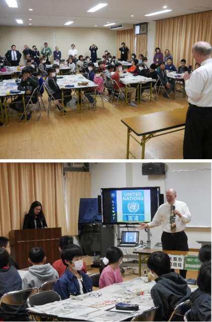 鶴見緑地に、国連の国際環境技術センターの施設があります。日本で唯一の施設で、世界にも数少ない施設のうちのひとつが日本にあるのです。そこのキース所長にきていただき出前授業をおこなっていただきました。秘書の方が英語を通訳してくれての授業です。国連の仕事や環境問題についてお話しいただきました。英語での講話授業がとても新鮮でよかったです。鶴見区長さんと、環境局環境施策部長さんも見学にこられていました。