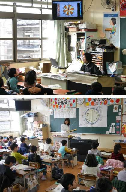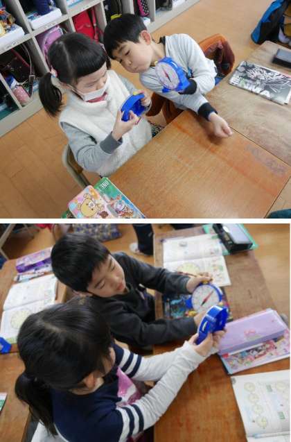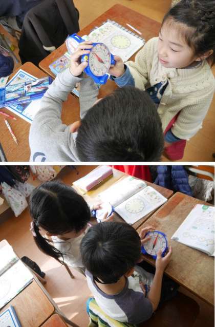 1年生では時計の読み方を学習しています。デジタル教科書で説明したり、拡大プリントで説明しています。子どもたちはお互いに時計があっているか見あっています。