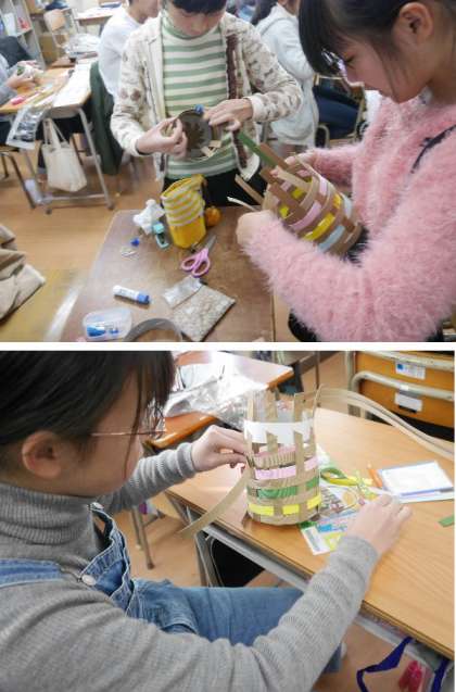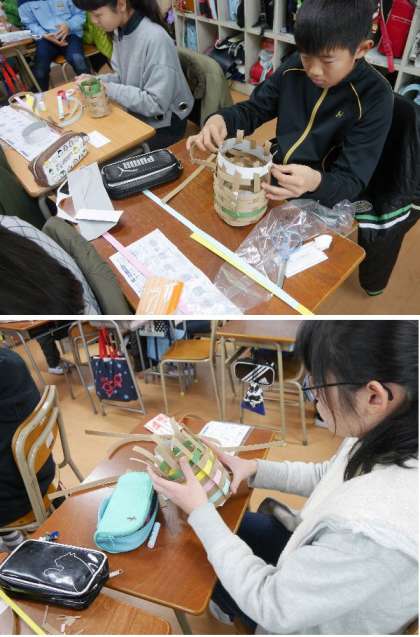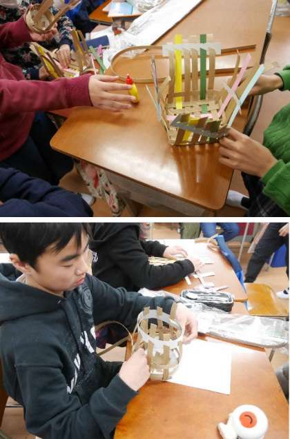 6年がカゴを編んでいます。だいぶ出来上がってきました。