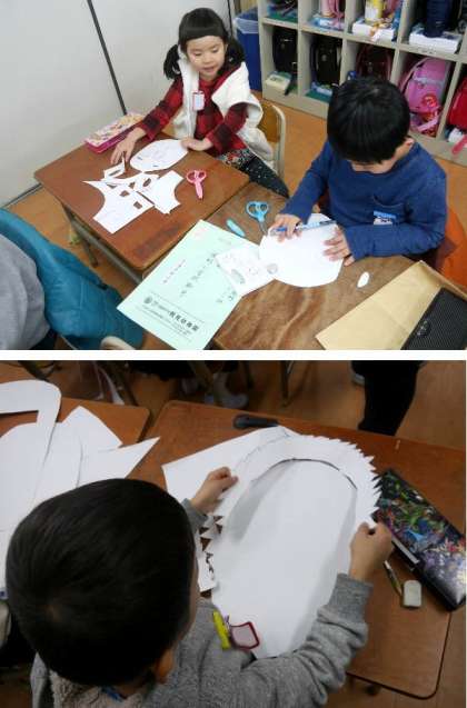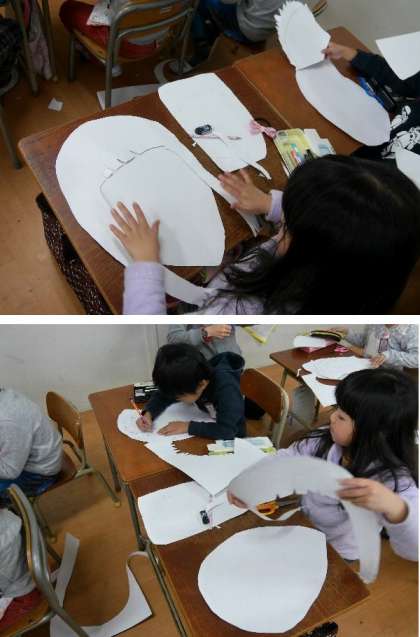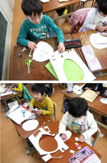 1年生が画用紙を切ってはりあわせて紙はんがを作っています。自分の顔を作っています。髪の毛や目、眉毛、鼻、くちびるなどを切り取って張り合わせていきます。どんな顔になるかな。