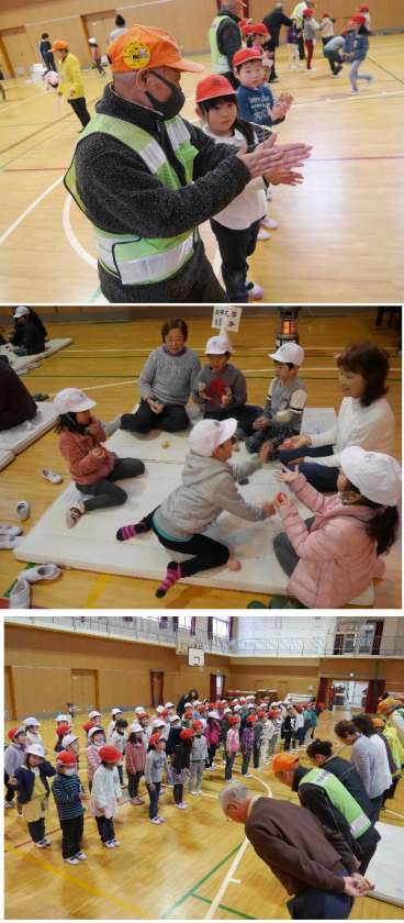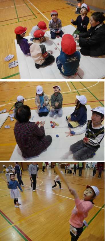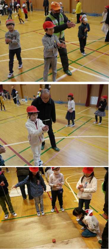 今日は、焼野地域の老人クラブの方々におこしいただき、1年生の子ども達が昔の遊びを教えていただき、一緒に遊んでいただきました。お手玉、こま、はねつき、竹とんぼで楽しく遊ぶことができました。