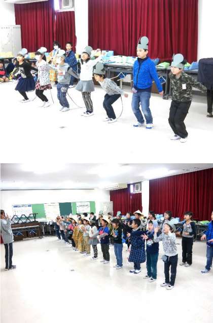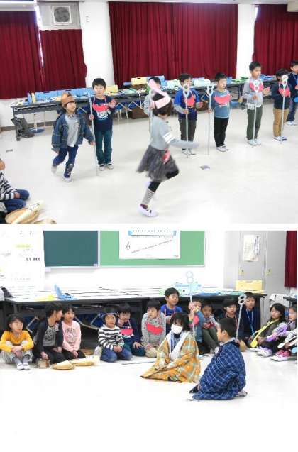 今度の土曜授業で発表する2年生は、国語の教科書にある「かさこじぞう」を音楽で劇をします。小道具などもそろい、最終の練習です。