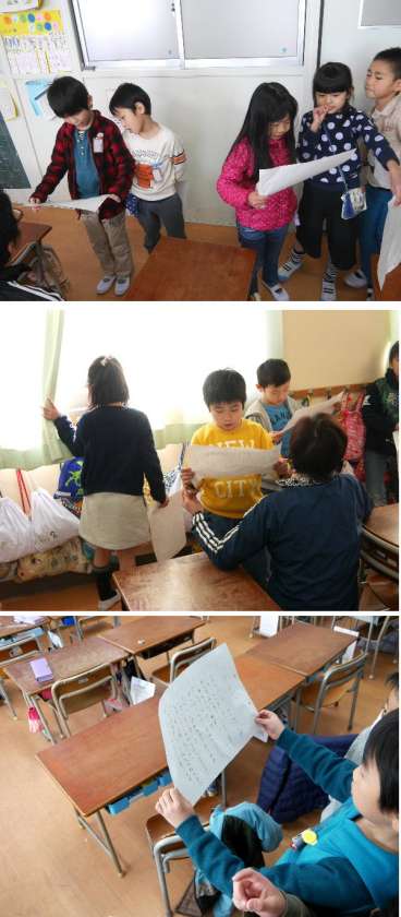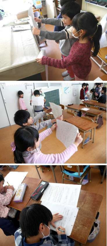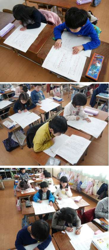 1年生では、一年間をふり返って、それぞれの行事の作文を書きました。今度の土曜授業で前で発表します。今日は、文を清書したり、読む練習をしていました。