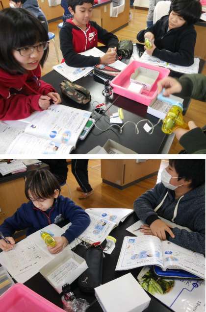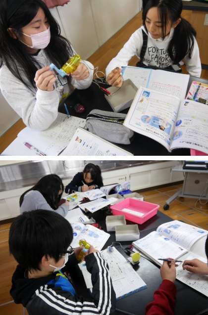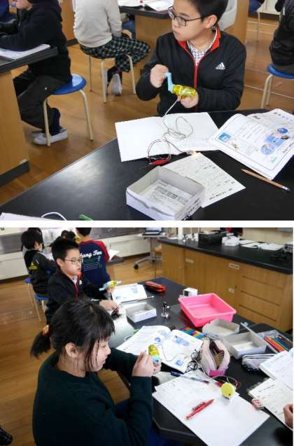 6年生の理科の授業です。手回し発電機に電球やモータをつけてハンドルを回してみました。時計回しや逆回し、ゆっくり回したりとどんな違いがあるかを調べています。