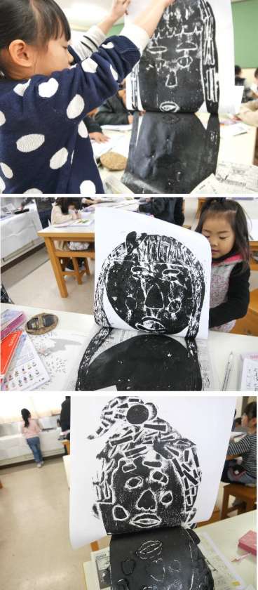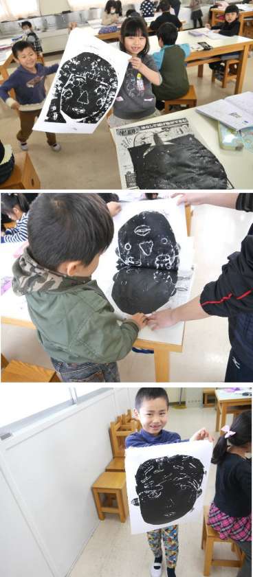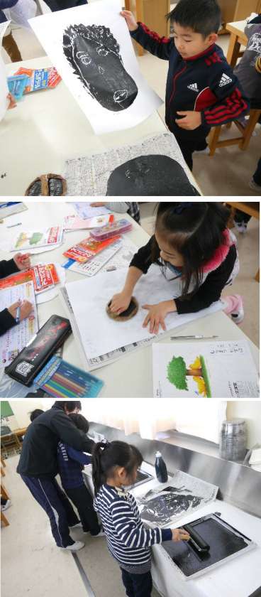 1年生が画用紙を切って貼りあわせた紙はんがの印刷をしています。ローラで黒インクを塗って、バレンできれいに紙をこすります。とても味のある作品ができあがってきましたね。