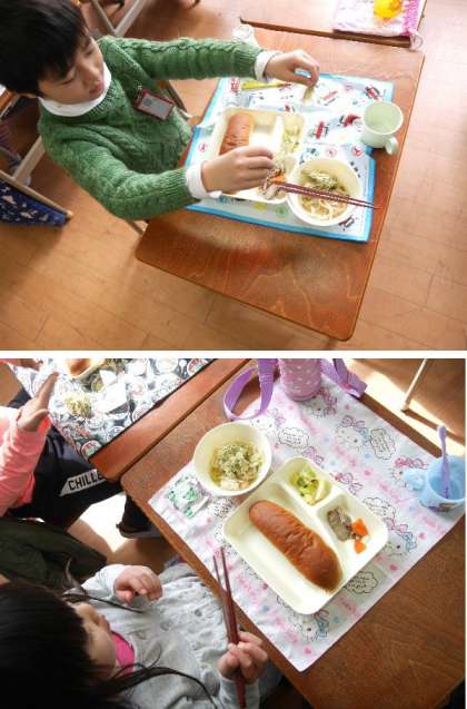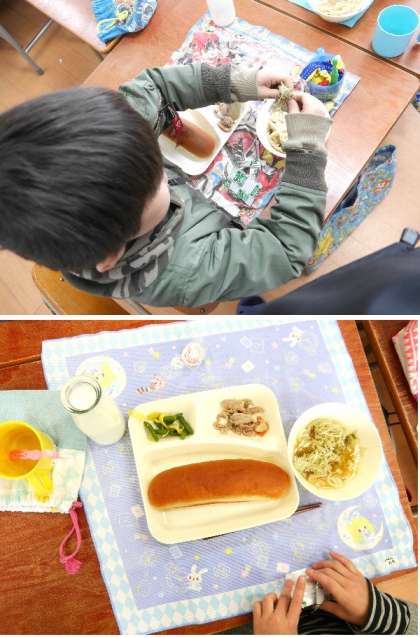 三角に切って、あまからく煮たうすあげと、かまぼこ、青ねぎが入ったきつねうどんに、とろろこんぶをかけて食べます。1年生はとろろこんぶを初めて食べる子もいるようで、最初はわからないようでしたが、「おいしい」といっていました。