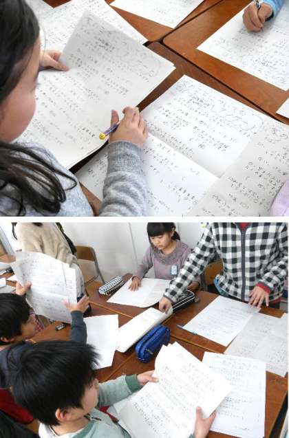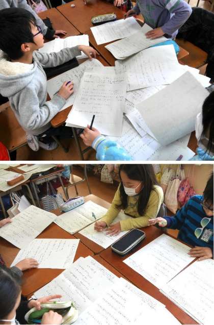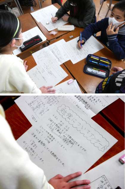 4年生の国語では、みんなが興味もっていることや、みんなの生活についてアンケートをとって調べて、ポスターを作って報告します。子ども達は、それぞれの班にわかれて、アンケートをつくり、集計しているところです。調べることは「勉強について」「読書について」「音楽について」「家のこと」「スポーツ・運動のこと」などでした。いろんなことがわかったかな。