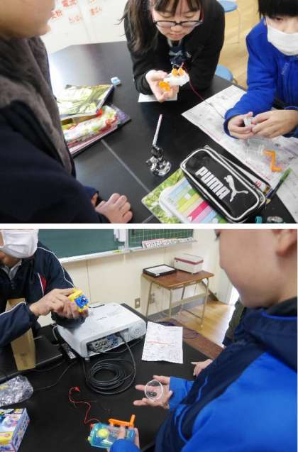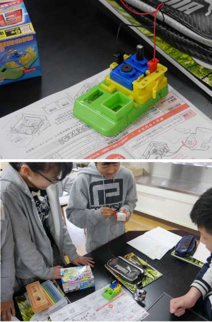 6年理科では、手回し発電器を使っていろいろな実験をしています。今日は、「発電した電気をたくわえて使うことはできないだろうか」と、コンデンサをつないで実験しています。