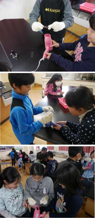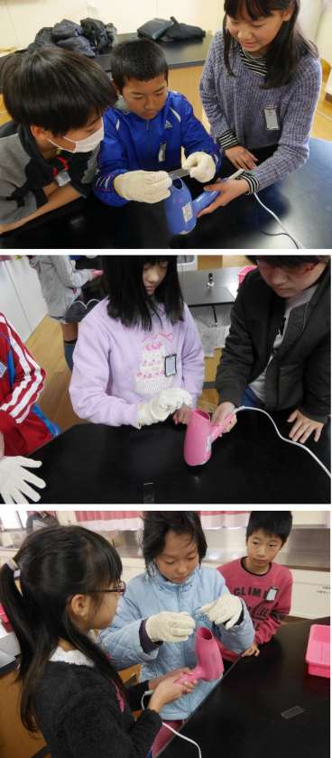 5年生の理科で特別授業をおこなっていただきました。純水と塩水をガラスののせて、ドライヤーで乾かしています。塩水は乾くと白くなります。純水はどうでしょうか?