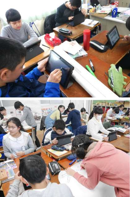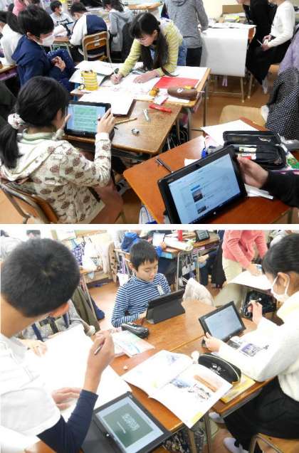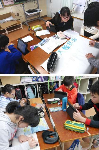 6年生の社会の授業で、タブレットを使って、日本と関係のあるいろいろな国について調べています。調べたことを壁新聞にしている人もいます。
