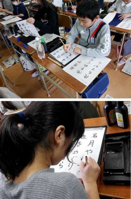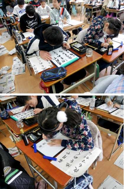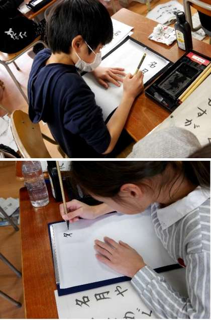 6年生の書写の授業です。「名月や 池をめぐりて 夜もすがら」と書いています。小筆で書くのはむずかしいね。