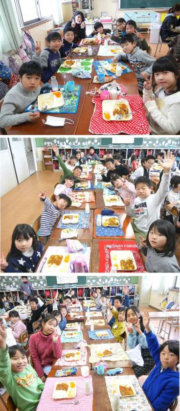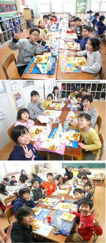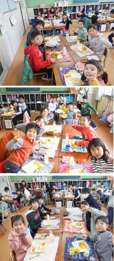 たてわり班交流給食、6年生を囲んで卒業をお祝いです。
