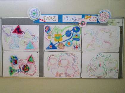 1年生の掲示板には、「ひかる ほしの くに」と題した子どもたちの作品が掲示されています。とてもたのしそうでしょう。