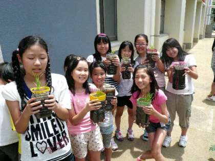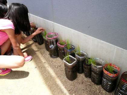 地域の方のご好意で、田植え用の苗をいただきました。5年生が大きなペットボトルに一苗ずつ植えました。泥の土に触るのに少し抵抗がありましたが、楽しく植えることができました。秋には実り収穫できるといいですね。生長が楽しみです。
