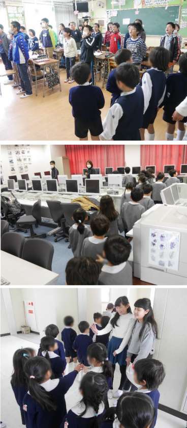 今日は近隣の幼稚園と保育園から学校見学に園児たちが来てくれました。校舎の教室を見学したあと、1・2年生たちと一緒に遊びました。6年生もやさしく迎えてくれていました。