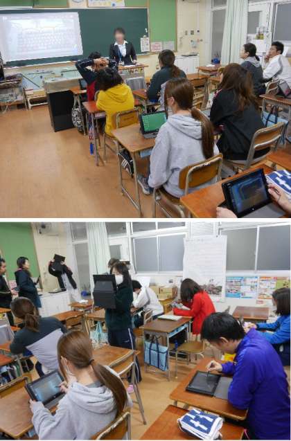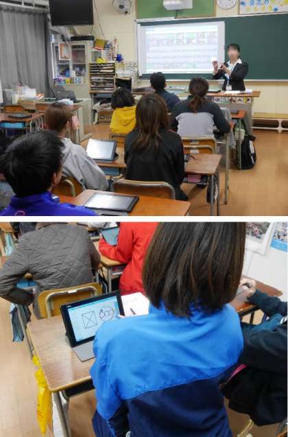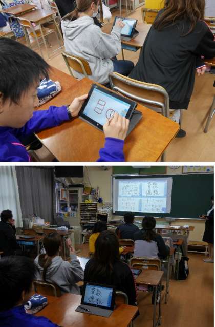先生たちがタブレットの操作研修をおこないました。授業でのいろいろな活用の仕方を具体的に実技研修を行いました。