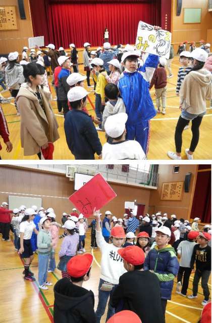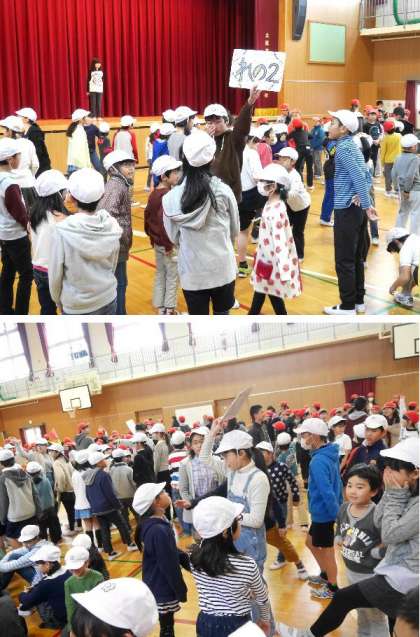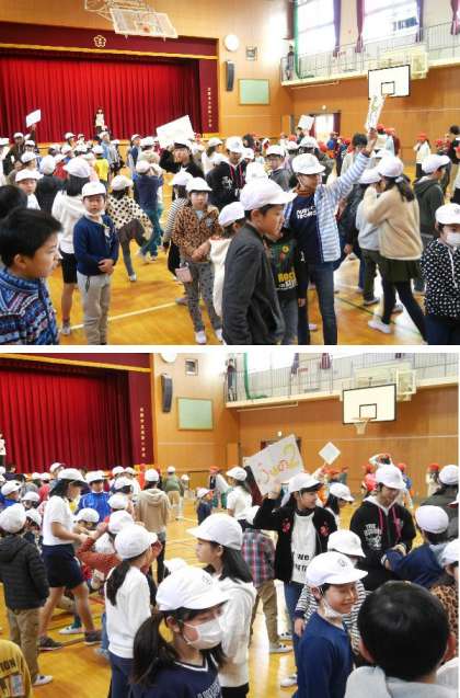 毎週の児童集会では6年生がファミリーを集めてメンバーを確認します。今日が最後の児童集会です。卒業お祝いの会でたてわり活動は最後です。少しさびしいですね。