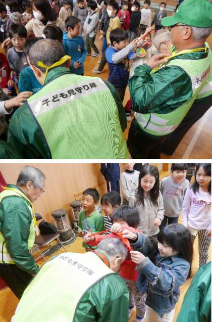 防犯教室の最後に、2・3年生から見守り隊の方に、自分たちで作った感謝のメダルをお渡ししました。いつも早朝より子ども達のために、身体をはって見守っていただき、本当にありがとうございます。毎日の見守りで、子ども達のあいさつがとても励みになると喜んでおられました。