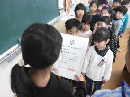 なわとび集会記録会の表彰を保健体育委員会が各学級をまわってしてくれました。「ものすごくとべたで賞」8の字とび38回・・・と6年の保健体育委員が、朝の時間に1年生の教室でわたしています。表彰してもらうとうれしいですね。