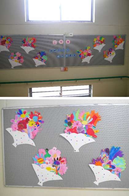 1年生と4年生の掲示板です。工夫をこらしてお祝い掲示。気持ちがもりあがっていきます。