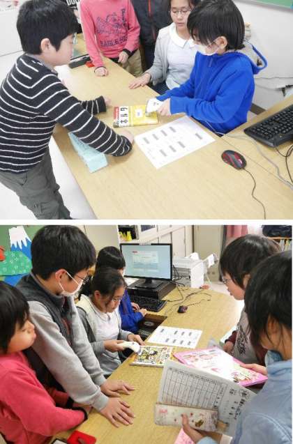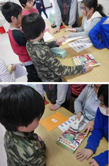 図書室の開館がお昼休みにありました。図書ボランティアさんもお手伝いにきてくれています。図書委員の子ども達は、さっそくバーコードで本の貸し出しを行っています。
