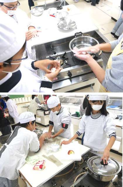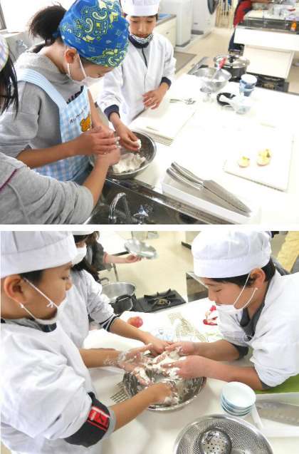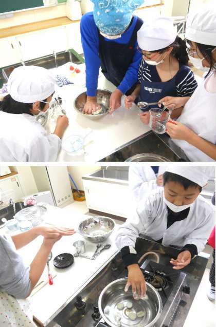 5年生が家庭科室で白玉を一生懸命にこねていました。おいしいフルーツポンチを作って、たべながら団らんするそうです。