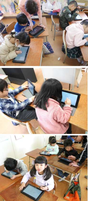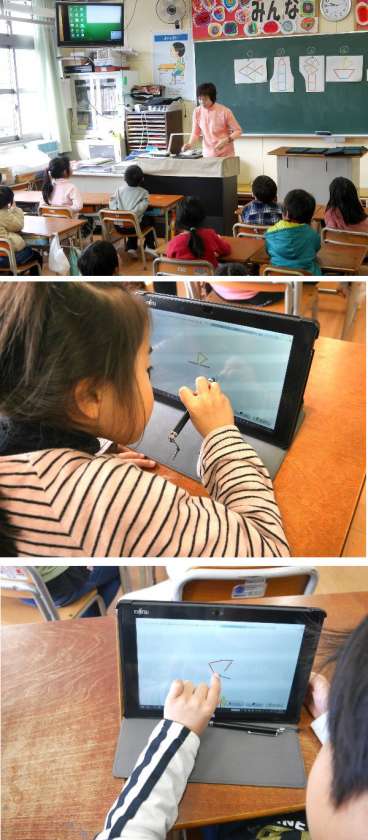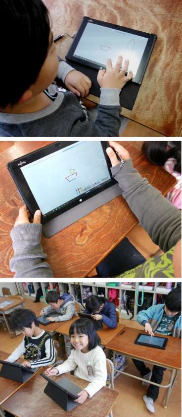 1年生がタブレットを初めて使っています。算数デジタル教材をつかっているところです。