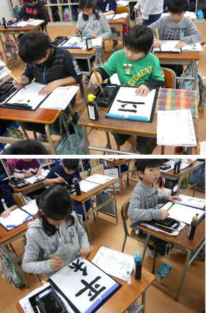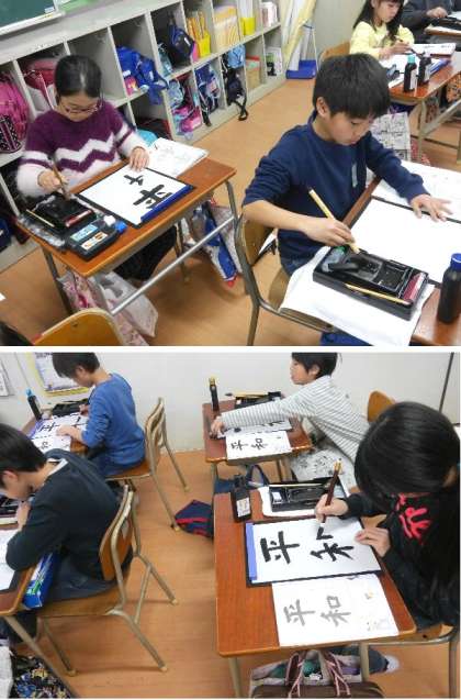 4年生の書写では、丹念に墨を硯ですってかいています。「平和」への願いをこめて。