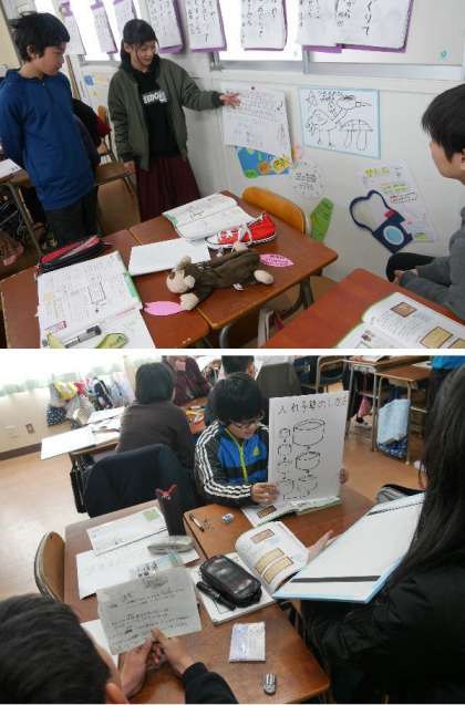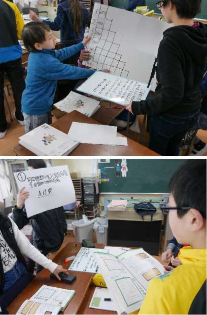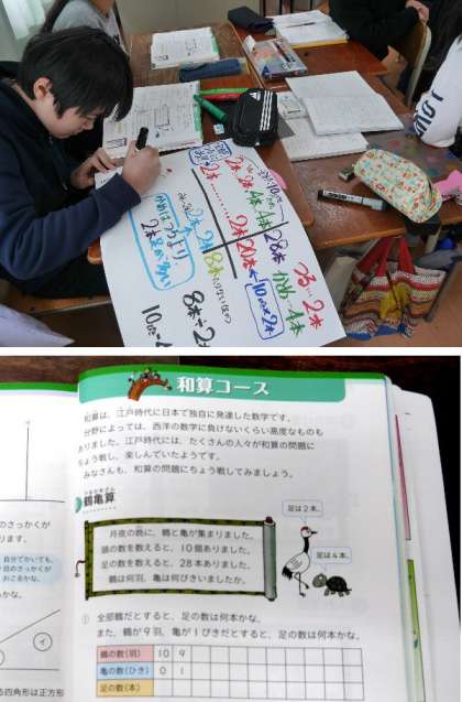 6年生の算数の授業です。鶴亀算や入れ子算、油わけ算などの問題にチャレンジして、その説明を班でまとめています。クラスで発表をします。