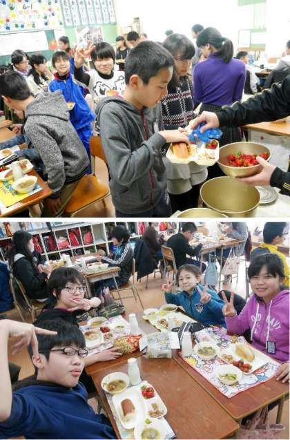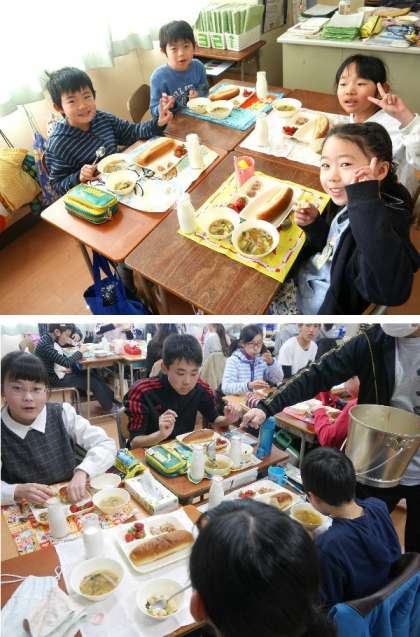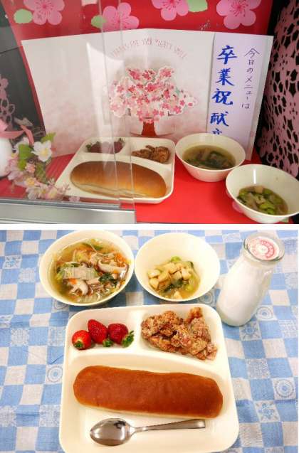 今日の給食は、ピリからあげ、中華スープ、ほたて貝と野菜のいためもの、いちご、パン、牛乳とメニューが多いです。卒業のお祝い献立でした。6年生は給食を3回食べたら卒業式をむかえます。