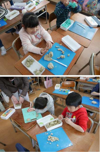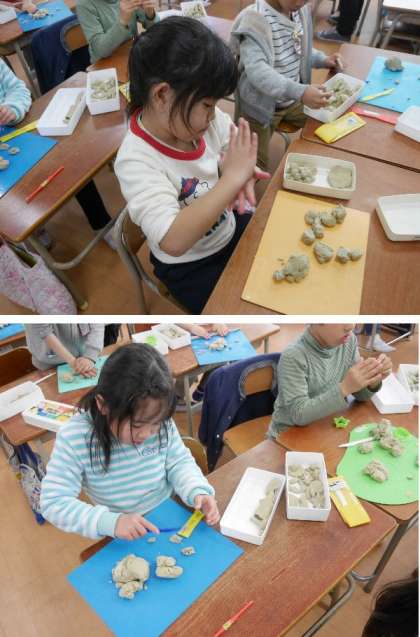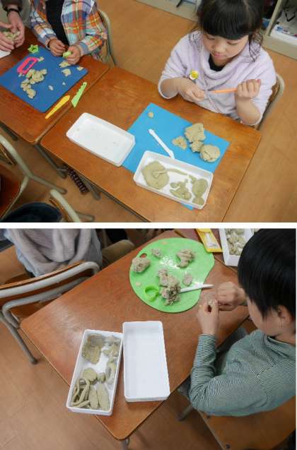 1年生がねんどで、いろいろな食べ物を作っていました。「みてみてみて!」ととても楽しそうに作っています。