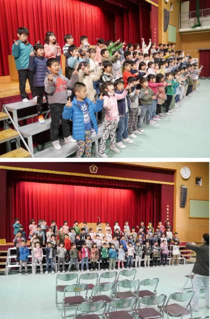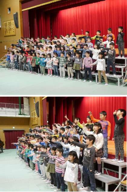 1年生は講堂で新入生を迎えるための歌の練習をしています。とても元気よく手話をしながら歌っています。新しいお友だちができるのはうれしいですね。