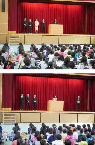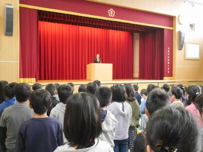 今日は始業式がありました。いよいよ今年1年の本格的な始まりの日です。2年生から6年生の子どもたちが講堂に集まって、1学期の始業式に臨みました。まずは、坂本校長先生の着任のあいさつがあり、続いて校長先生から、この4月に焼野小学校に新たに着任した先生の紹介がありました。