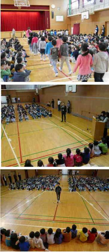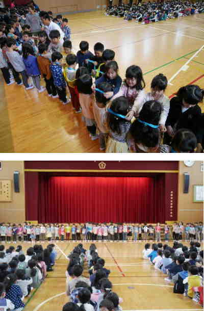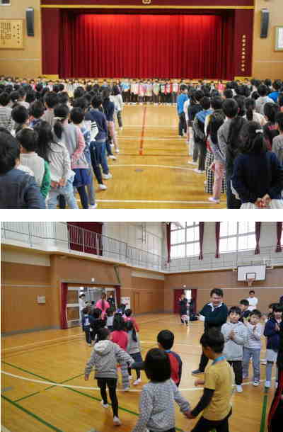 1年生の子どもたちが初めて2〜6年生のお兄さん、お姉さんと顔合わせをする対面式行われました。「1年生になったら」の曲で入場したあと、校長先生のお話がありました。続いて児童代表の歓迎の言葉があり、2年生からのメダルのプレゼントと式は進んでいきました。1年生みんなでお礼の言葉を言ってから、最後に全員で校歌を歌いました。お兄さんお姉さんの間を通りながら、「あしたははれる」の曲に合わせて退場して、式が終わりました。焼野小学校ではたて割り班での活動など、違う学年の人と交流する機会がたくさんあります。みんなで協力して楽しい学校にしていきましょうね。