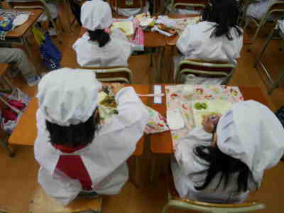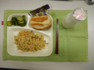 今日から給食が始まりました。1年生にとって、小学校生活初めての給食のメニューは、焼きそばときゅうりのしょうがづけ、黒糖パンと牛乳でした。1年生のみんなは少し緊張しながらも、美味しそうに食べていました。