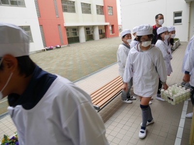 昨日から給食が始まりましたが、毎年この時期は6年生が1年生の給食の配膳を手伝います。休み時間に給食室に行き、牛乳や食器などの重いものを1年生の教室まで運びます。