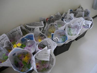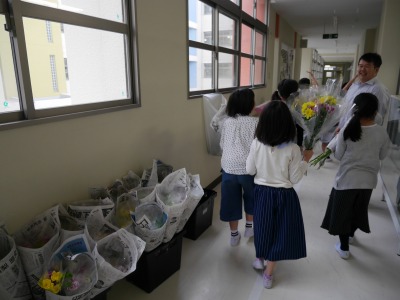 毎年4月に鶴見区の学校になにわ花いちばさんからお花が贈られます。今年もかわいいお花をいただきました。今年は和歌山県で育てられた「スプレーマム」という花でした。「マム」というのは菊の花の海外での呼び名だそうです。それぞれのお家で大切に飾ってください。