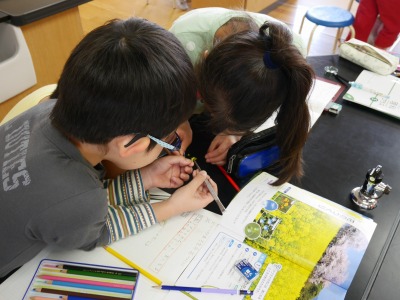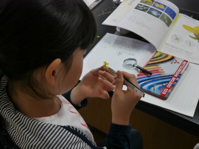 5年生は理科の学習で花のつくりについて学習しました。学習園にあるアブラナの花を採取して、理科室で花びらやおしべなどの部分に分けて、枚数や本数などの観察をして記録をとりました。
