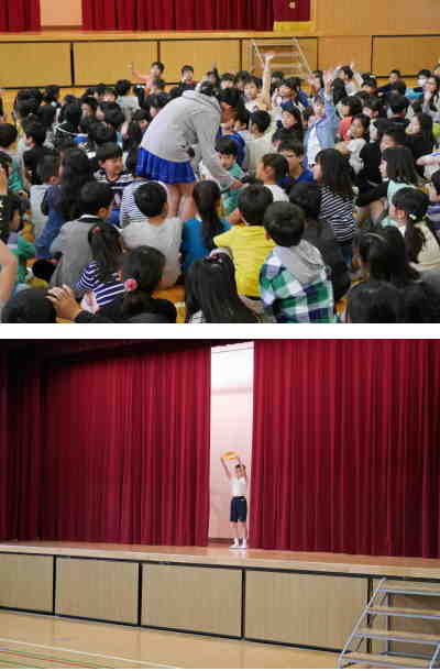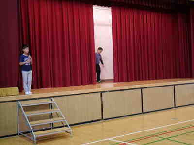 月曜日の児童朝会に対して木曜日は児童集会です。児童集会は集会委員を中心に子ども主体で運営されます。今日の集会は舞台の幕を少しだけ開いた状態で閉めて、幕の間を移動する物をあてるというゲームでした。最後の問題は、先生が登場してみんな大盛り上がりでした。