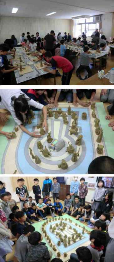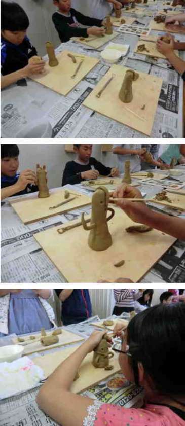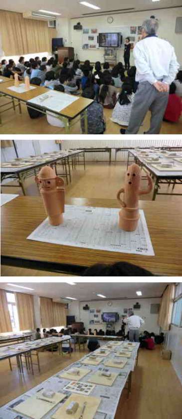6年生が近つ飛鳥博物館が企画する出前授業に取り組みました。これは、古墳がつくられた時代や古墳に関することを学習した後、自分たちで実際に埴輪づくりにチャレンジするという内容のものでした。埴輪づくりでは自由な発想で個性豊かな作品が出来上がりました。最後は前方後円墳を模したシートの上に作品を並べて、お互いに鑑賞しました。