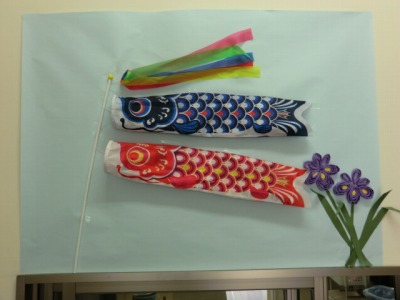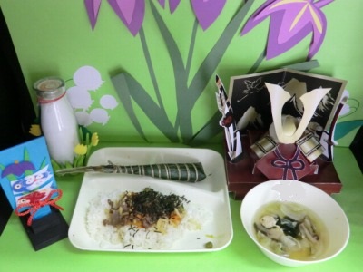 今日の給食はこどもの日の献立でした。内容は牛肉のちらしずし、すまし汁、ちまき、牛乳でした。給食室では、調理員さんがいつもサンプルケースや入り口などに季節の行事などに合わせた心のこもった飾りつけをしてくれています。今はこどもの日の飾りになっています。この飾りを見ることもみんなの楽しみのひとつです。