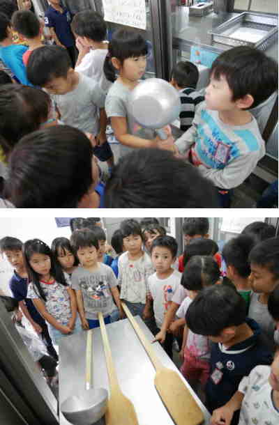 給食室の見学もしました。いつも給食を取りに行くところに、調理員さんが使わなくなった調理道具を展示してくれました。1年生のみんなは、その大きさに驚いていました。