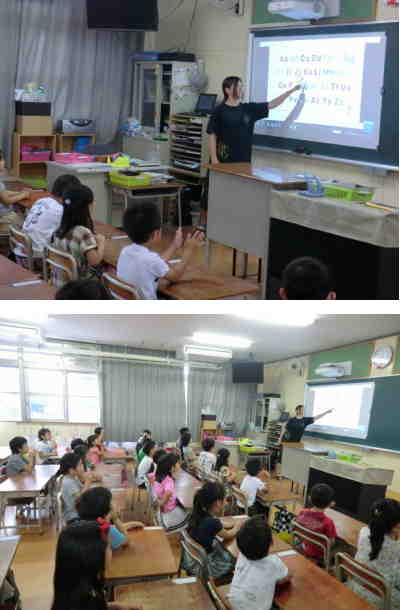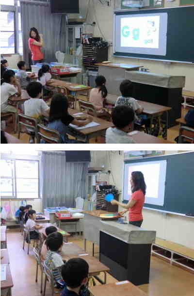 水曜日の朝は外国語活動(モジュール学習)です。今週から各学年の活動のようすを順番にお伝えします。まずは1年生からです。