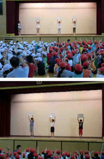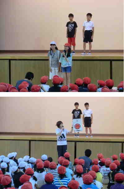 今日の児童集会は日本一をテーマにした「三択クイズ」でした。なかなか難しい問題が出題されました。例えば「みかんの生産量が日本一の都道府県」などです。皆さん答えはお分かりになりますか。クイズの後は保健・体育委員会が雨の日に使える遊び道具を製作したことを紹介し、各クラスで使ってもらうように呼びかけました。また、暑い時期なってきたので、熱中症に関する注意や対策などの話が、係の先生からありました。