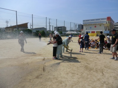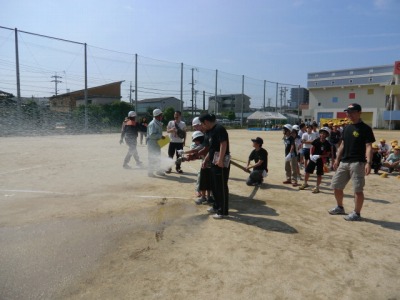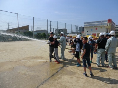 6年生は実際の消火活動に使われるポンプを使っての放水体験をしました。