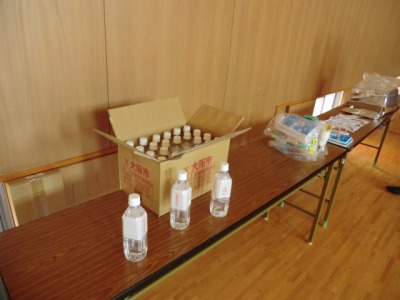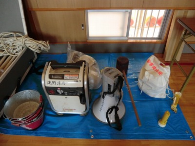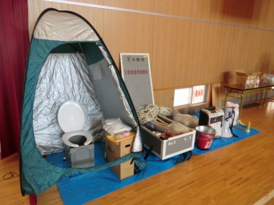 学校の備蓄倉庫に置かれている物資(一部)の展示です。