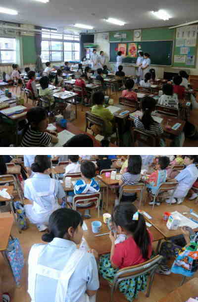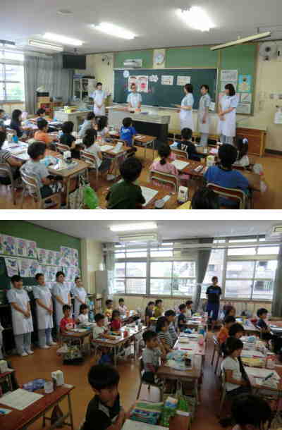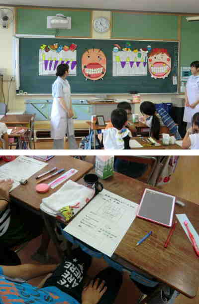 今日の2時間目と3時間目に、1年生と3年生と5年生が歯科衛生士さんと歯科衛生士になるための勉強をしている方々から、正しい歯磨きの仕方について教えてもらいました。