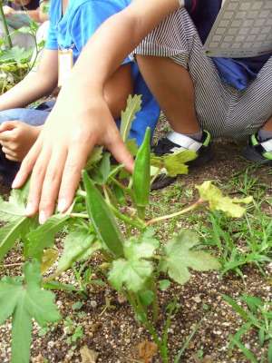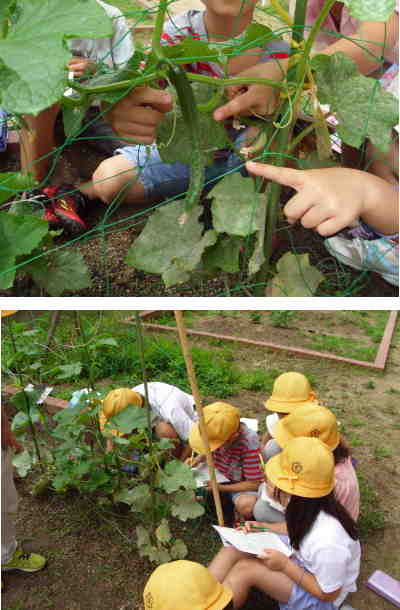 2年生が学習園に植えた野菜が大きく育ち、収穫できるようになりました。観察と収穫の風景です。