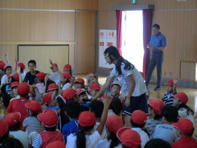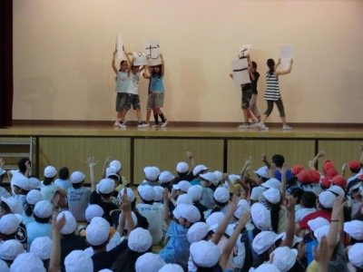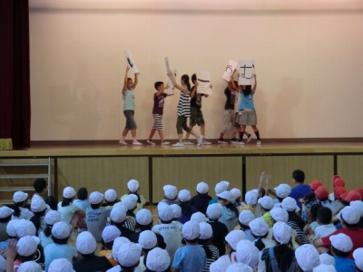 今週も集会委員会が考えた楽しいゲームをやりました。題して「文字バラバラゲーム」です。一つの言葉をバラバラにして一文字ずつ画用紙に書き、委員会の人が1枚ずつ持って舞台の上を動き回り、元の言葉を当てるというゲームです。問題が進むごとに文字数が増え、難易度も上がっていきました。