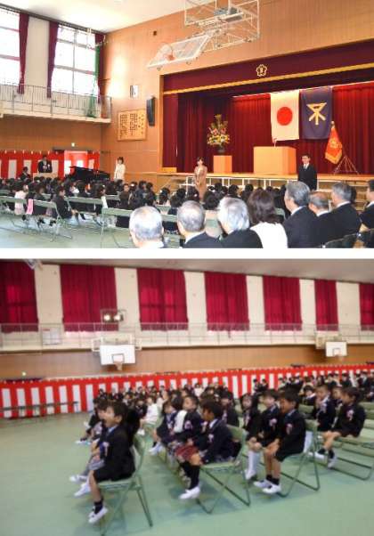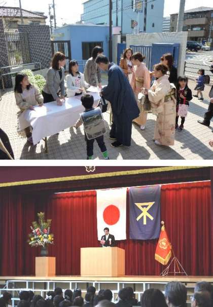 受付では、6年生がお手伝いをしてくれています。入学式で、校長先生から、「元気よくあいさつしよう」「みんなで助けあいましょう」「しっかり聞いて、お話しましょう」と、3つのがんばってほしいことをお話ししました。